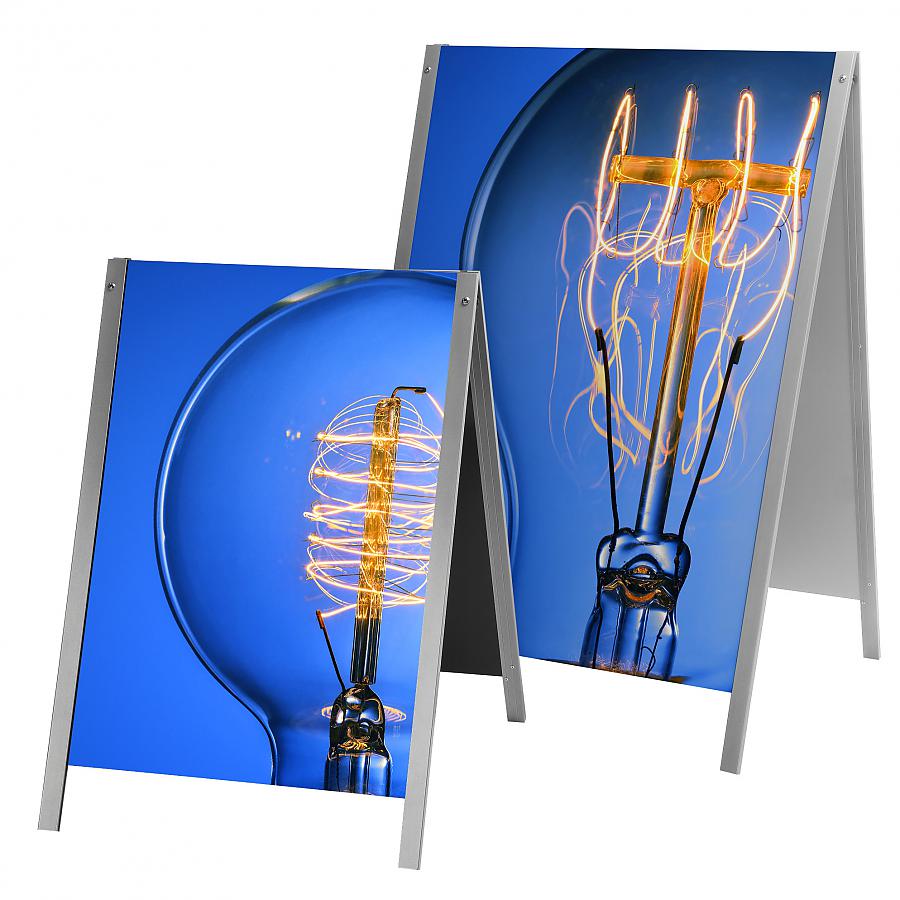 The Adversizer is a premium portable easy-to-store double sided A-Frame. It has a unique feature where slots in the frame can be used to insert a temporary graphic over top of the main image for promotional use.